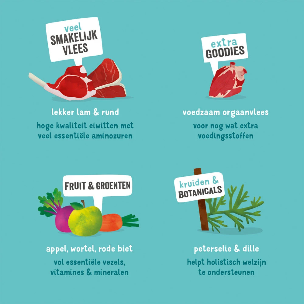 Lam 30%, rund 26%, mineralen, wortels 2%, broccoli 1%, rode bieten 1%, appels 1%, spinazie 1%, peterselie 0,1% en dille 0,1%.