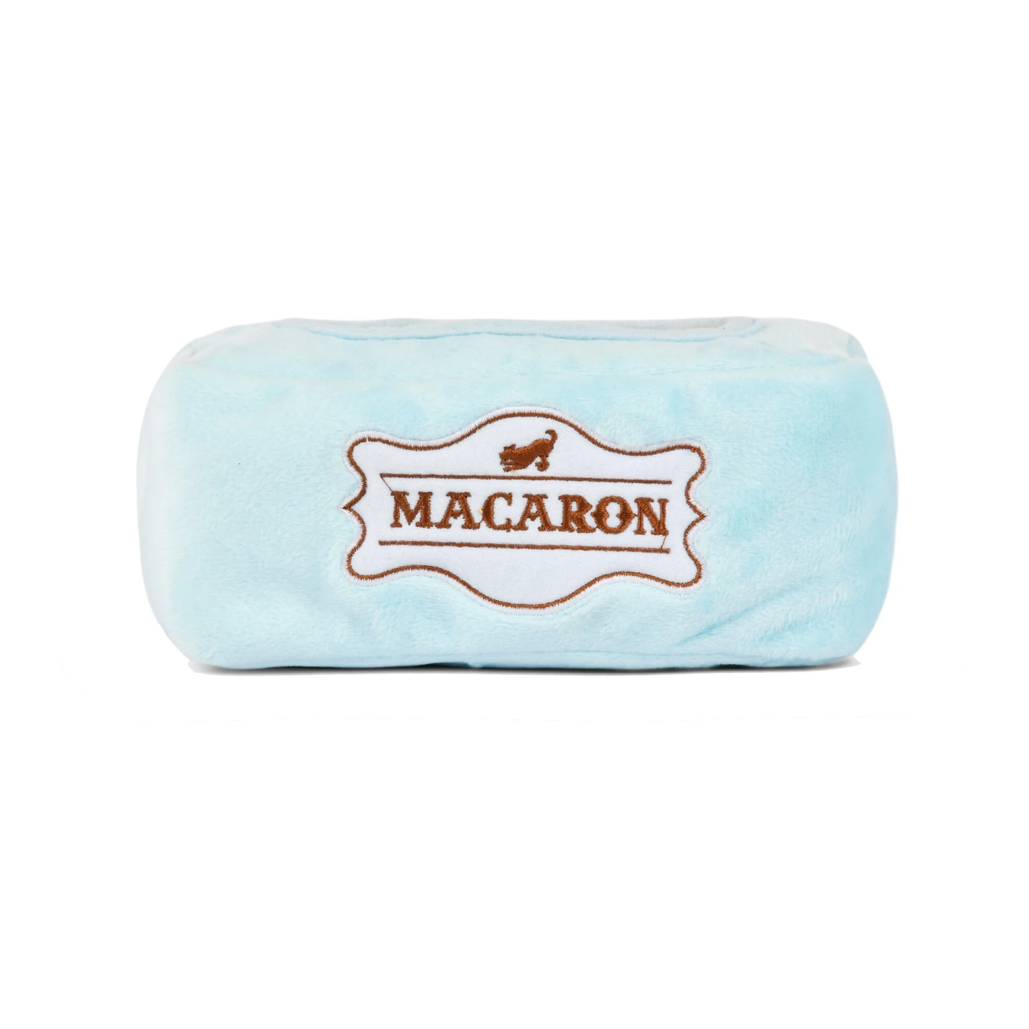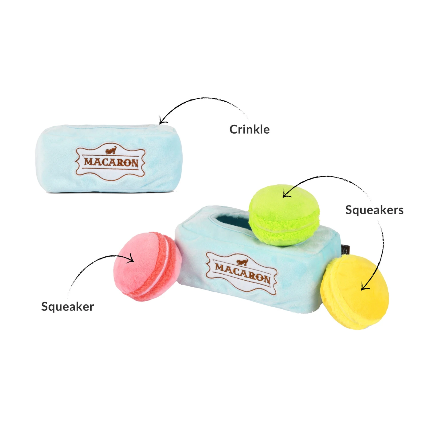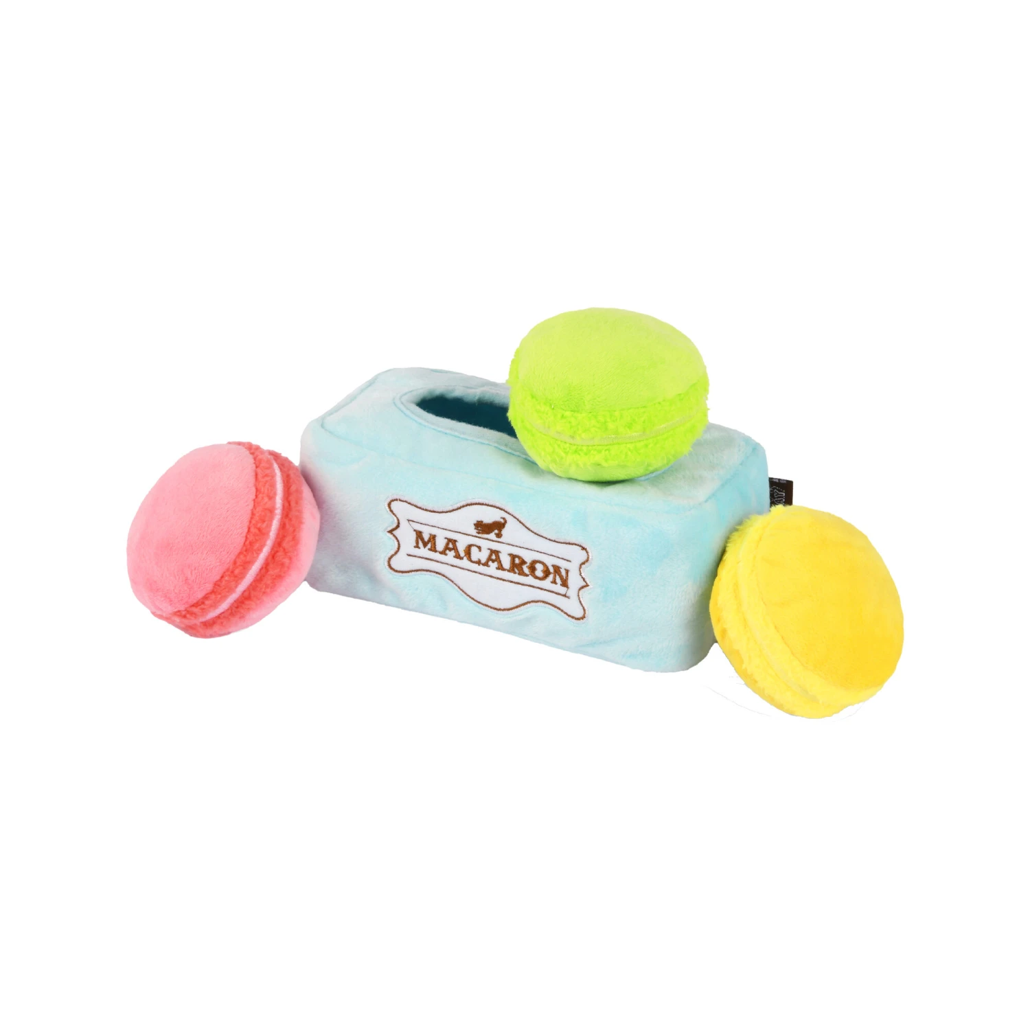 Dit overheerlijke doosje macarons uit het Pup Cup Café van P.L.A.Y. is hét speeltje voor uw hond. Om het speeltje extra stevig te maken, is het handgemaakt met een dubbele buitenlaag en extra sterke stiksels. De milieuvriendelijke PlanetFill® vulling is gemaakt van 100% gerecyclede plastic flessen. Het speeltje bevat ook geen AZO-kleurstoffen en kan na het spelen in zowel de wasmachine als in de droger. Voor extra veel speelplezier zitten er piepers in de macarons en een leuk kreukeleffect in het doosje!